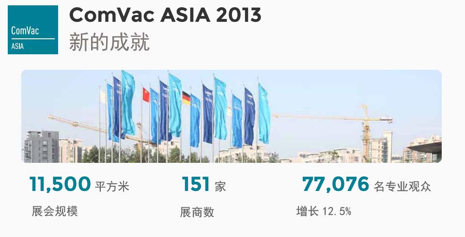 2013年,壓縮氣體技術展區迎來了新的發展機遇,正式更名為上海國際壓縮機及設備展覽會(ComVac ASIA),并經德國漢諾威展覽公司董事會批準,成為德國漢諾威工業博覽會(HANNOVER MESSE)空壓及真空技術展(ComVac)的全球系列展。通過ComVac ASIA,展商和觀眾將有機會共享世界第一大工業展覽會德國漢諾威工業博覽會的全球行業資源,并與來自全球及本地空氣壓縮技術行業的專業人士進行面對面的交談。